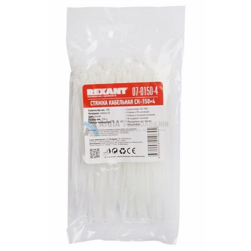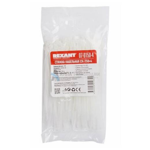 Rexant 07-0150-4/07-0151-4 – хомут нейлоновый (кабельная стяжка) для крепления или обвязки в жгут кабелей и проводов, крепления гибких гофротруб, а также других предметов к несущей поверхности или для соединения между собой. Такая стяжка используется при проведении электромонтажных работ, при монтаже структурированных кабельных систем, для бытовых нужд, а также в других отраслях народного хозяйства.