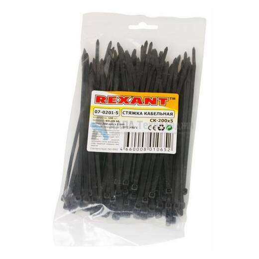 Rexant 07-0200-5/07-0201-5 – хомут нейлоновый (кабельная стяжка) для крепления или обвязки в жгут кабелей и проводов, крепления гибких гофротруб, а также других предметов к несущей поверхности или для соединения между собой. Такая стяжка используется при проведении электромонтажных работ, при монтаже структурированных кабельных систем, для бытовых нужд, а также в других отраслях народного хозяйства.