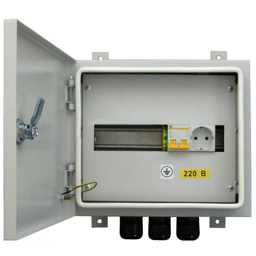 В B-270x310x120 установлено термореле с системой обогрева, включающейся и выключающейся автоматически при заданной температуре; пакетный выключатель для коммутации напряжения 220 В; розетка для подключения блоков питания аппаратуры. Клеммные зажимы предохраняют от прикосновений к оголенному проводнику, перегрева в месте соединения и короткого замыкания. Три гермоввода обеспечивают подключение кабелей питания (220 В) и других кабелей (например, витой пары). В пустующие отсеки могут быть установлены до 7 модулей шириной 17.5 мм каждый. Климатический шкаф закрывается трехгранным ключом.