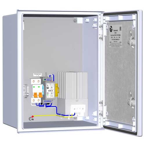- обогревателем термошкафов ОТШ-100, оборудованным встроенным биметаллическим выключателем, ограничивающим температуру поверхности радиатора до +90°С;
