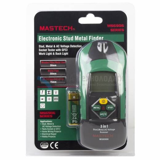 MS6906 – многофункциональный прибор с большим набором возможностей. Предназначен для поиска металла, переменного напряжения, а также скрытых конструкций. С его помощью можно обнаружить винты, гвозди, саморезы, шпильки, иголки и другие металлические предметы на глубине до 30 мм, металлические трубы на глубине до 60 мм и напряжение на глубине до 75 мм. Результаты поиска отражаются на дисплее прибора и обозначаются с помощью звукового сигнала.