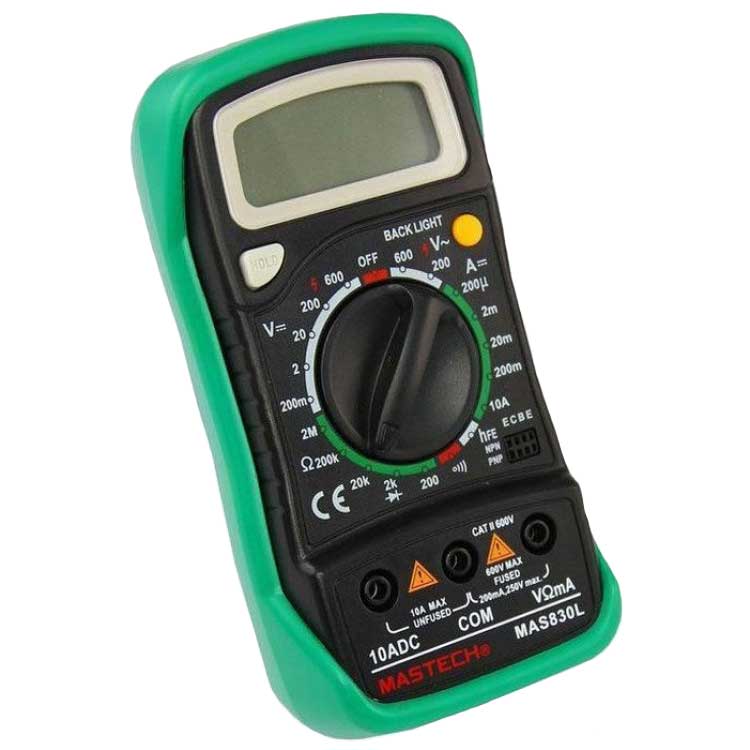 MAS830L – электроизмерительный прибор, измеряет постоянное и переменное напряжение, постоянный ток и сопротивление в цепи. А также, с помощью данного прибора можно проводить тестирование диодов и прозвонку целостности цепи.
