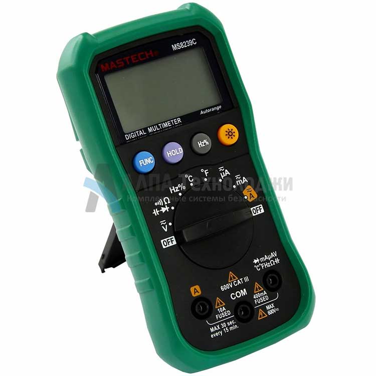 MS8239C – электроизмерительный прибор, измеряет постоянное и переменное напряжение, постоянный и переменный ток, сопротивление в цепи, емкость, частоту и температуру. С помощью данного прибора можно проводить тестирование диодов и осуществлять прозвонку целостности цепи.