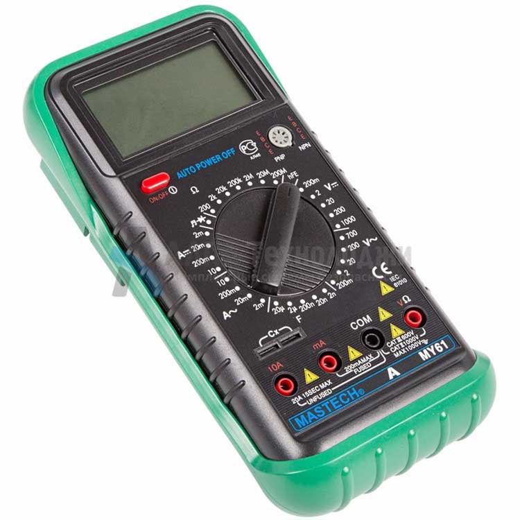 Mastech MY61 – цифровой мультиметр измеряет величины силы постоянного и переменного тока, постоянного и переменного напряжения, сопротивления, коэффициента усиления биполярных транзисторов и емкости конденсаторов. Высокое входное сопротивление не вносит погрешности при измерениях величин и говорит о высокой точности прибора. Выбор пределов измерения величин производится вручную путем установки нужного положения многопозиционного переключателя.
