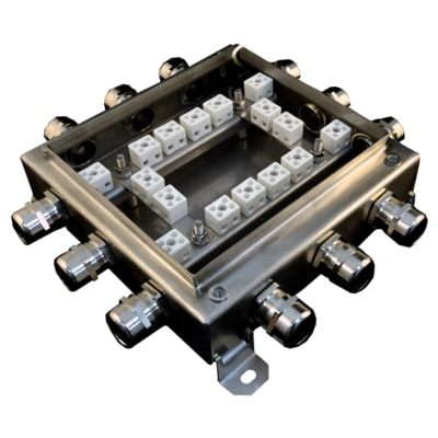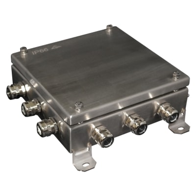 КМ-О (32к)-IP66 2020 нерж – коробка монтажная огнестойкая. Корпус и все внутренние металлические элементы изготовлены из нержавеющей стали толщиной 1.2 мм. Коробка может эксплуатироваться в химически агрессивных средах, на морских платформах. Плотность прилегания крышки к корпусу обеспечивается силиконовой прокладкой.