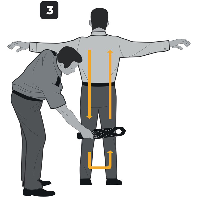 5. Проведите металлодетектором через верхнюю часть плеча и следуйте от плеча в сторону кисти руки. Переместите металлодетектор на нижнюю часть кисти и далее следуйте до подмышечной впадины. Сканируйте боковую часть тела вниз до стопы, переместите сканирующую часть металлодетектора на внутреннюю часть ноги. Продолжайте проводить досмотр снизу вверх с переходом на противоположную ногу, а затем, дойдя до противоположной стопы, перейдите на внешнюю часть ноги и поднимитесь до другой подмышечной впадины. Повторите движения в обратной последовательности, которые вы проделали с противоположной рукой, как это проиллюстрировано на рисунке 2. Обратите внимание, чтобы в процессе сканирования не допускались касания тела досматриваемого.