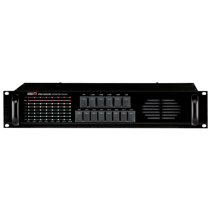 PM-6228 – блок монитора, предназначен для визуального и акустического контроля аудио сигналов на трансляционных линиях. Для мониторинга устройство подключается, например, к выходам усилителей мощности или к выходам контроллера ECS-6216P.