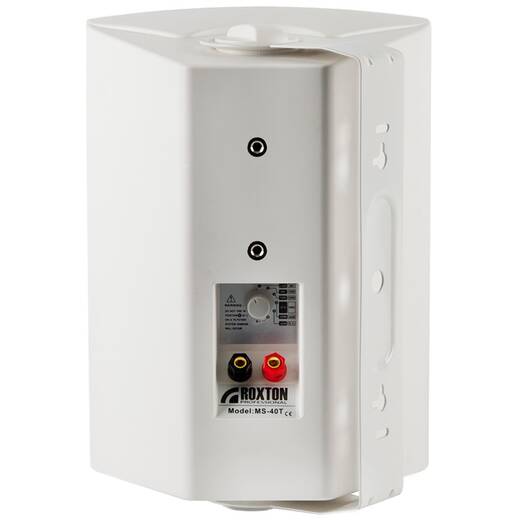 Выполненная из белого ABC-пластика, она имеет приятный внешний вид, что позволяет применять её в инсталляциях с повышенными требованиями к внешнему виду оборудования. Также она оборудована специальным П-образным металлический кронштейном, значительно облегчающим монтаж на различные поверхности. Встроенный трансформатор с отводами позволяет устанавливать значения мощности 2.5, 5, 10, 20 или 40 Вт. Помимо этого, задняя панель акустической системы имеет специальный переключатель, с помощью которого можно установить необходимый режим работы (низкоомный или трансформаторный) и выходную мощность акустической системы.