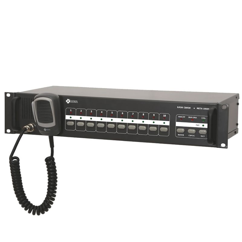 МЕТА 19555 – блок обратной связи в комплекте с тангентой для установки в 19” шкаф RACK, предназначен для обеспечения двухсторонней полудуплексной связи постов связи зон пожарного оповещения с диспетчером в составе приборов управления оповещателями (ППУ) и других технических средств систем оповещения, управления эвакуацией и диспетчерской связи.