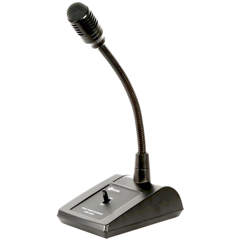 Кардиоидная направленность микрофона позволяет использовать пульт в помещениях с высоким уровнем окружающих шумов. Гибкая, так называемая "гусиная шея", позволяет выставить высоту и положение микрофона в удобное для работы положение.