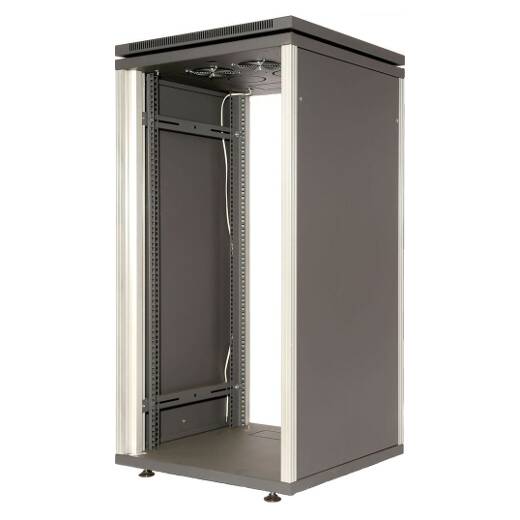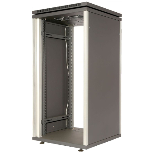 В верхней крышке шкафа установлено 4 вентилятора на постоянное напряжение 24 В. Спереди шкаф закрывается стеклянной, а сзади стальной легкосъемными дверьми. Боковые стальные стенки, также при необходимости можно снять. Съемные двери и стенки облегчают сборку, наладку системы в шкафу, а также и дальнейшее ее обслуживание. Шкаф поставляется на регулируемых опорах, возможна поставка на 4-х роликах.