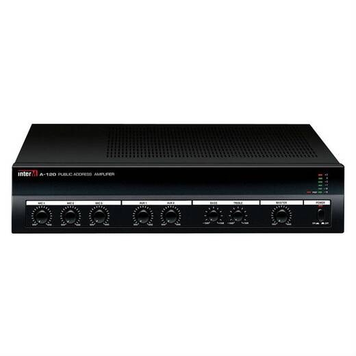 A-120 – предназначен для построения однозоновых систем оповещения и музыкальной трансляции. Имеет 3 микрофонных и 2 линейных входа, при появлении сигнала на приоритетном первом микрофоне - сигналы с остальных входов приглушаются. Сигналы поступающие с трех микрофонных и двух линейных входов одновременно, суммируются микшером-усилителем. Регуляторы на передней панели дают возможность менять громкость. Кроме этого, на передней панели расположены два регулятора тембра, общий регулятор уровня сигнала MASTER, индикатор включения питания, индикаторы уровня выходного сигнала и срабатывания защиты усилителя мощности. Усилитель подходит для установки в 19" стойку, закрепляется кронштейнами BKT-A120.