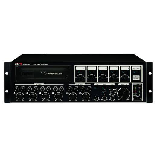PAM-520 – усилитель на 5 зон трансляции. Каждой зоне трансляции можно задать свой уровень громкости. Динамические и конденсаторные микрофоны подключаются через один из четырех универсальных входов. Два линейных входа предназначены для источников сигнала линейного уровня. Вход для подключения АТС имеет высший приоритет, при появлении на нём сигнала автоматически приглушаются сигналы с остальных входов. Передняя панель усилителя включает в себя регуляторы громкости, тембра, кнопочный селектор выбора зон, общий регулятор уровня сигнала MASTER, клавиша сигнала «Гонг» и «Сирена», регуляторы сигналов сопряжения с АТС, индикаторы питания, срабатывания защиты и уровня выходного сигнала. Усилитель дает возможность установки одного модуля музыкальной трансляции: AM/FM или CD/MP3 проигрывателя. При дополнительном приобретении микрофонной консоли RM-05A оповещение может происходить на дистанции до 500 метров от усилителя. Управляющие контакты REMOTE POWER могут включить усилитель из дежурного режима.