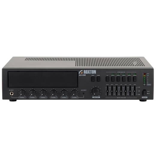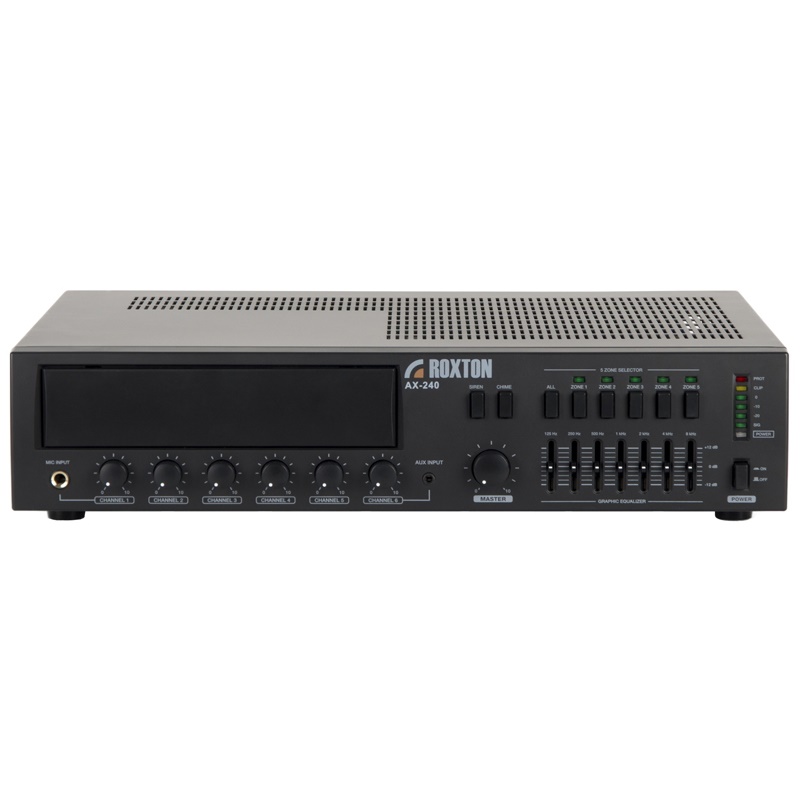 AX-240 – зональный усилитель класса D мощностью 240Вт позволяет строить распределённые системы речевого оповещения и музыкальной трансляции. В первую очередь он предназначен для озвучивания помещений. Пять линейных и семь микрофонных аудиовходов, с индивидуальными регуляторами громкости, фантомным питанием и тремя уровнями приоритетов, дают широкий выбор источников аудиосигнала, а дополнительный низкоомный аудиовыход позволяет подключать к усилителю акустические системы бытового и профессионального уровней.