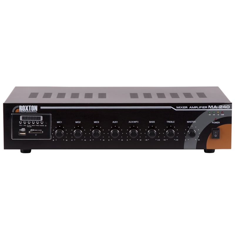MA-240 – трансляционный микшер-усилитель мощностью 240Вт – решение для систем речевого оповещения и музыкальной трансляции, который в первую очередь предназначен для фонового озвучивания помещений. Два линейных и три микрофонных аудиовхода на задней панели дают широкий выбор источников аудиосигнала, а дополнительные низкоомные аудиовыходы позволяют подключать к усилителю акустические системы бытового и профессионального уровней.