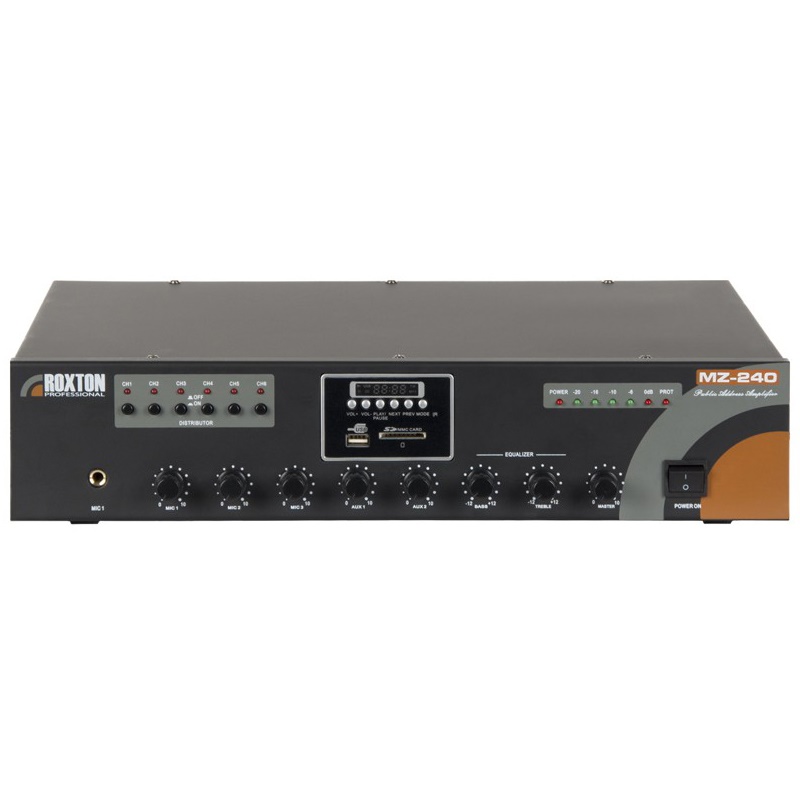 MZ-240 – комбинированный усилитель мощностью 240Вт позволяет строить многозонные системы речевого оповещения и музыкальной трансляции, не требуя при этом подключения дополнительных источников аудиосигнала. Два линейных и три микрофонных аудиовхода на задней панели дают широкий выбор источников аудиосигнала, а дополнительные низкоомные аудиовыходы позволяют подключать к усилителю акустические системы бытового и профессионального уровней.