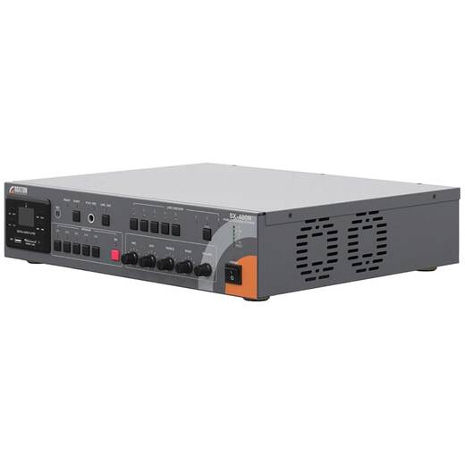 SX-480 – комбинированная система оповещения представляет собой цифро-аналоговый моноблок для построения полнофункциональных систем оповещения и управления эвакуацией (СОУЭ) 3-го типа, объектовых (ОСО) и локальных (ЛСО) систем оповещения. Система включает в себя блок автоматического контроля до 5-ти линий громкоговорителей, трансляционный усилитель мощностью 480 Вт с 2-мя линейными и 1-м микрофонным аудиовходами, темброблоком, поканальными регуляторами громкости и селектором зон. Помимо этого, в систему встроен аудио проигрыватель с поддержкой внешних USB/SD накопителей и FM тюнер, что делает ненужным использование внешних источников аудиосигнала.