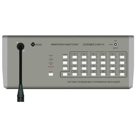 Соловей-МП-04 – микрофонный пульт на 4 зоны, предназначен для работы в составе прибора пожарного управления оповещением "Соловей 2" и обеспечивает возможность речевого оповещения и подачи сигнала оповещения "Сирена".