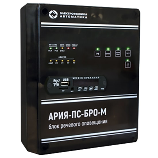АРИЯ-ПС-БРО-М – блок речевого оповещения с возможностью трансляции музыки и встроенным плеером. Сюда поступает сигнал о возникновении чрезвычайной ситуации, затем блок формирует нужное сообщение и передает его для трансляции речевым оповещателям. Здесь же расположены кнопки управления оповещением: включение тестового и тревожного режимов, сброс оповещения и сброс неисправностей.