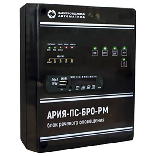 АРИЯ-ПС-БРО-РМ – блок речевого оповещения с возможностью трансляции музыки, встроенным плеером и резервным источником питания.