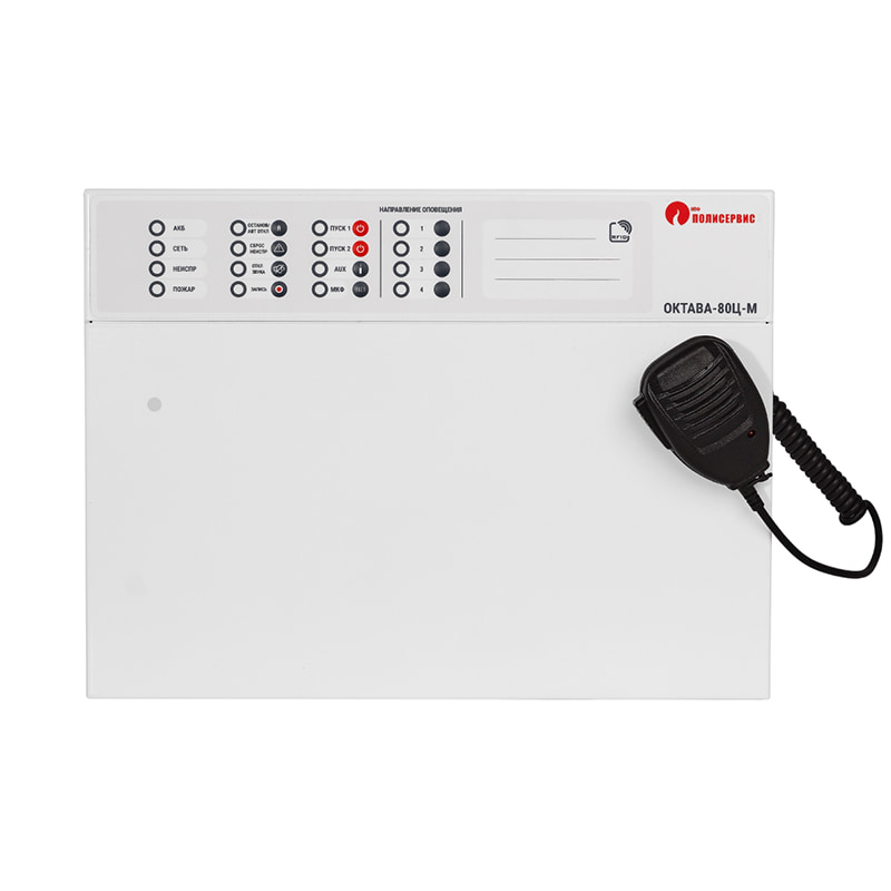 Октава-80Ц-М – блочно-модульный прибор управления оповещением, входящий в состав системы "Октава-М", предназначен для построения систем оповещения и управления эвакуацией 3-го и 4-го типов (СОУЭ) в зданиях и сооружениях, а также для трансляции информационных и музыкальных программ. Он сочетает функции источника питания, аудио-процессора, усилителя и контроллера линий, обеспечивая надежную работу даже при пропадании сетевого напряжения благодаря встроенным аккумуляторам и автоматическому переходу на резервное питание.