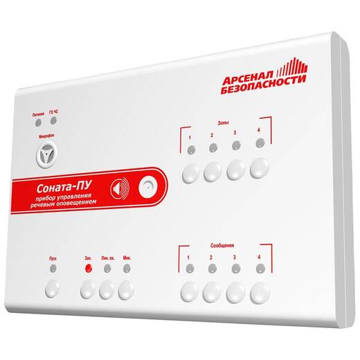 Соната-ПУ – прибор управления речевым оповещением для трансляции предварительно записанных речевых сообщений, музыкальных программ через линейный вход, сигналов ГО и ЧС и речевых сообщений через микрофонный разъем. Трансляция производится через подключенные к прибору усилители низкой частоты Соната-К-120У или аналогичные им, а также активные речевые оповещатели Соната-УП в системах пожарной сигнализации на объектах различной степени сложности с контролем линий управления и оповещения.