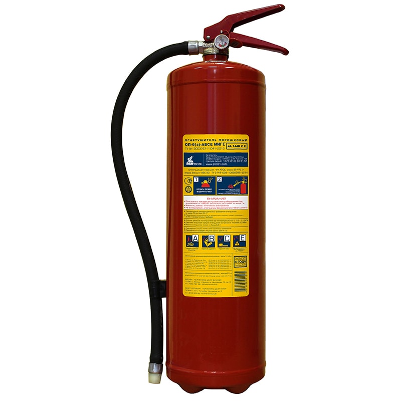 ОП-6(з)-АВСЕ МИГ Е – огнетушитель порошковый закачной с повышенной огнетушащей способностью. Предназначен для оснащения органов и подразделений по чрезвычайным ситуациям, защиты объектов народного хозяйства, транспортных средств, а также для применения в бытовых условиях в качестве первичного средства тушения пожаров классов:
