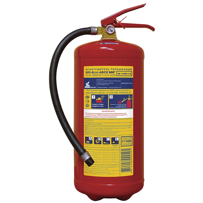 ОП-8(з)-АВСЕ МИГ – огнетушитель порошковый закачной предназначен для оснащения органов и подразделений по чрезвычайным ситуациям, защиты объектов народного хозяйства, транспортных средств, а также для применения в бытовых условиях в качестве первичного средства тушения пожаров классов: