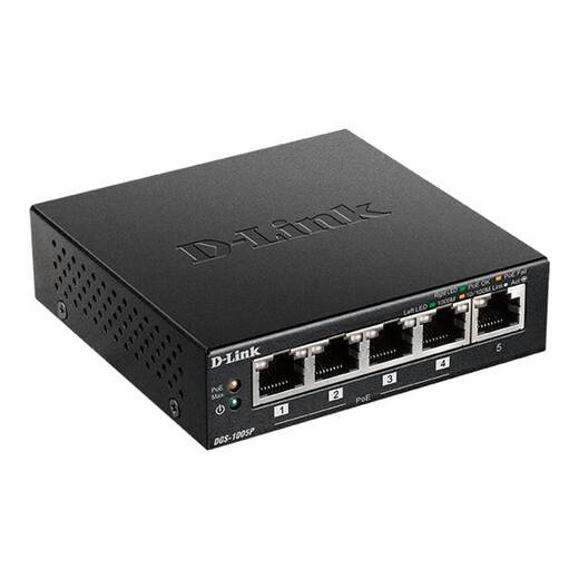 DES-1005P/B1A – неуправляемый коммутатор с 5 портами 10/100Base-TX, функцией энергосбережения и поддержкой QoS (4 порта с поддержкой PoE 802.3af/802.3at (30 Вт), PoE‑бюджет 60 Вт).