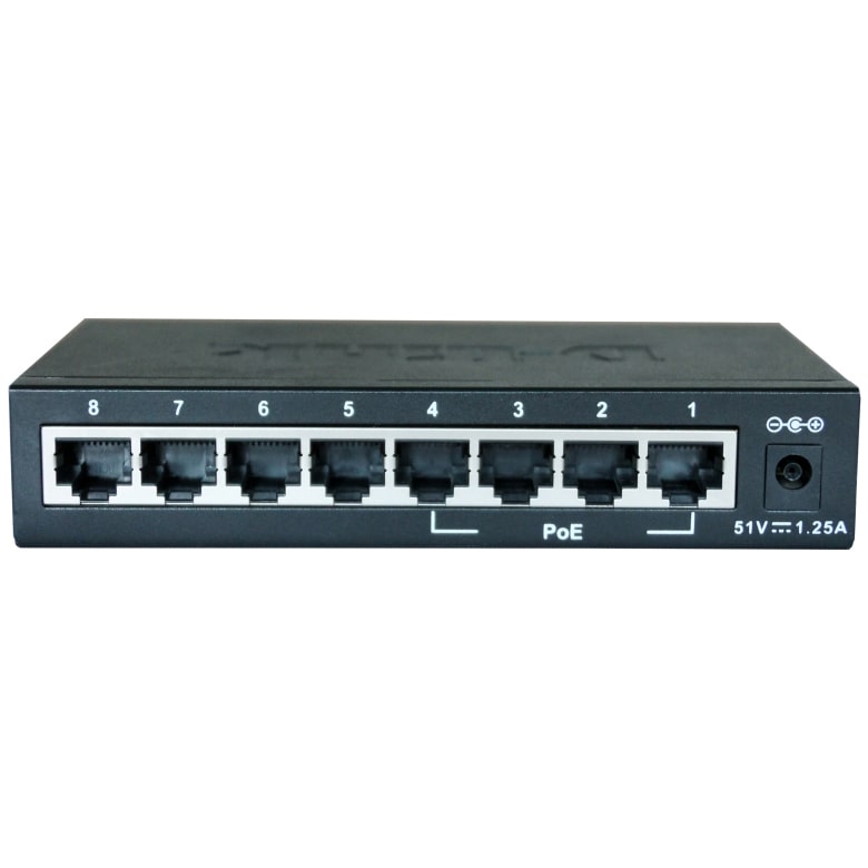 DES-1008P/C1A – неуправляемый, настольный PoE коммутатор, поддерживает автоматическое определение полярности MDI/MDIX, оснащен пассивной системой охлаждения, что обеспечивает бесшумную работу, а также оснащен индикаторами диагностики, которые отображают статус и активность соединения.