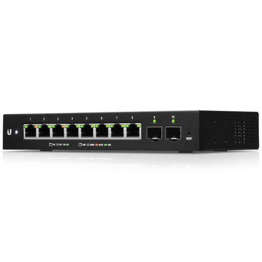 EdgeSwitch 10XP – управляемый коммутатор, имеющий 8 гигабитных портов RJ45 с раздачей PoE 24 В, а также два SPF-порта для оптоволоконного подключения.