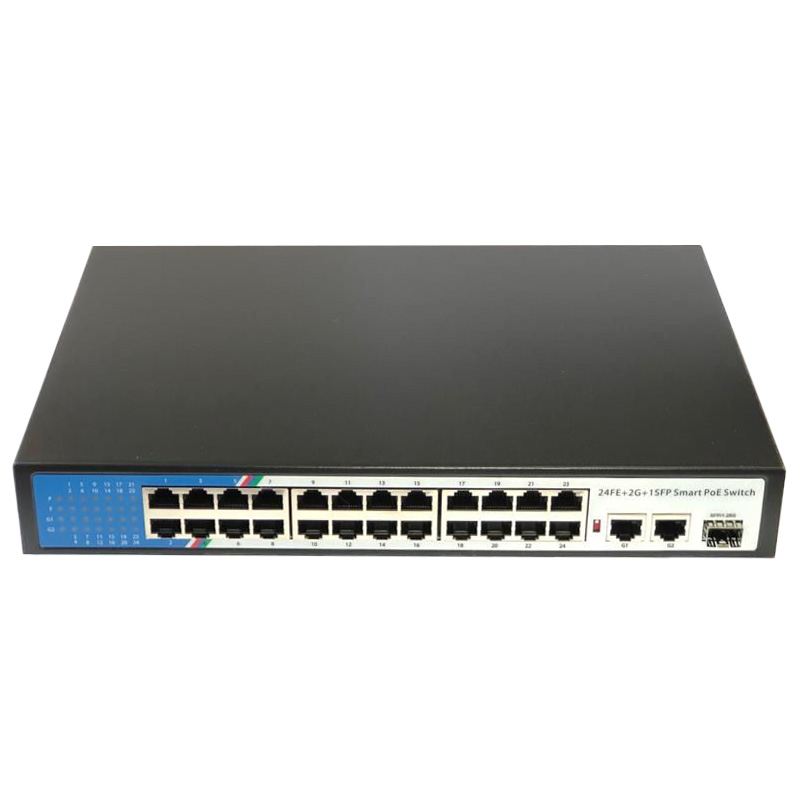 - 24 PoE-порта 10/100 Мбит/с, 2 Uplink-порта 10/100/1000 Мбит/с, 1 SFP-порт;