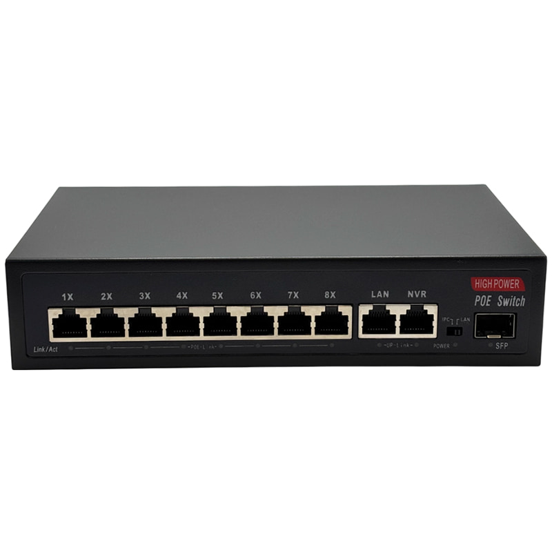 HN-POE2108G – неуправляемый PoE-коммутатор на 10 портов, 8 из которых с поддержкой технологии POE стандарта 802.3af/at (Type A) 100Мбит. Максимально поддерживаемая мощность подключаемых устройств составляет 30Вт на порт. Дополнительно присутствуют 2 медных порта с максимальной скоростью до 1000Мбит и 1 оптический порт SFP: два медных порта предназначены для подключения видеорегистратора и для подключения к сети интернет-провайдера, а SFP-порт позволяет организовать высокоскоростное оптическое соединение. Данный коммутатор может работать в режиме IPC, который позволяет передавать данные без питания по PoE на расстояние до 250 метров на скорости до 10 Мбит/с. Максимальная суммарная нагрузка на POE составляет 135 Вт