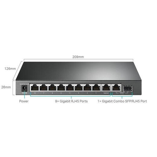 - 9 гигабитных портов RJ45 и 1 гигабитный комбо-порт SFP/RJ45;