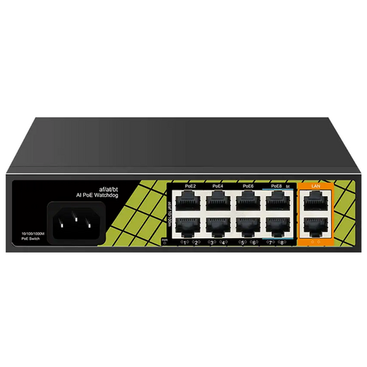 TSn-8FP10G2 – PoE коммутатор 8×100 Мбит/с PoE портов (6 портов 802.3af/at, максимальная мощность PoE 30 Вт на порт, 2 порта 802.3af/at/bt, максимальная мощность PoE 60 Вт на порт) + 2×1000 Мбит/с порта Uplink, автоматический PoE watchdog, встроенный блок питания, грозозащита и защита от статического электричества.