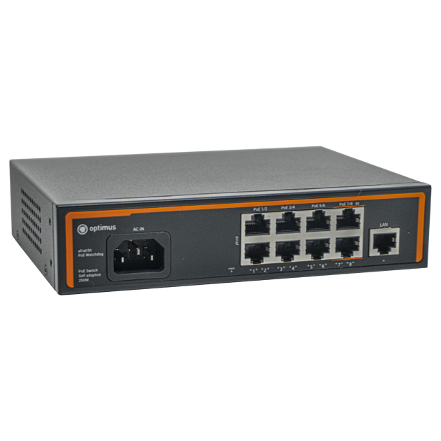 PoE-порты соответствуют стандартам PoE IEEE802.3af/at. 8 порт у коммутатора соответствует стандартам IEEE802.3af/at/bt. Каждый порт подает питание мощностью до 30 Вт (в bt стандарте до 60 Вт) на сетевое оборудование. Это позволяет размещать оборудование в труднодоступных местах вне зависимости от расположения электрических розеток и минимизировать прокладку кабеля. Максимальная дальность подключения оборудования составляет 250 метров. Коммутатор сам определяет длину кабеля и переключает режимы функцией Self-Adaptive. До 160 м скорость составляет до 100 Мбит/с от 160 до 250 м скорость составляет до 10Мбит/с.