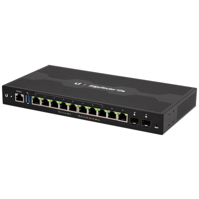 EdgeRouter 12P – высокопроизводительный маршрутизатор, имеет 10 гигабитных Ethernet-портов (могут быть настроены для обеспечения PoE-питанием устройств airMAX) и 2 SFP-порта для оптоволоконной связи. Скорость маршрутизации достигает 3.4 миллионов пакетов в секунду (при их размере до 64 байт), а канальная скорость составляет 6.8 Гбит/с (1518 байт и больше).