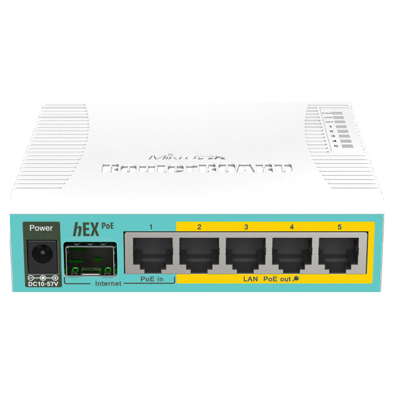 Mikrotik hEX PoE - маршрутизатор в пластиковом корпусе с SFP, пятью гигабитными портами и функцией раздачи PoE. Порты 2-5 могут питать другие PoE-совместимые устройства с таким же вольтажом как на роутере, что позволяет избавиться от лишних кабелей и блоков питания. Благодаря компактному дизайну и приятному внешнему виду устройство прекрасно впишется в любой интерьер класса SOHO. Маршрутизатор Mikrotik hEX PoE собран из качественных материалов с соблюдением всех необходимых стандартов.