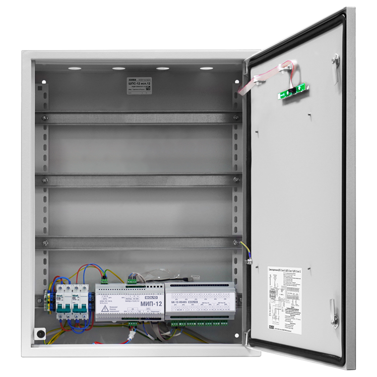 ШПС-12 исп.12 – шкаф с резервированным источником питания. Предназначен для размещения приборов пожарной автоматики, приемно-контрольных приборов охранно-пожарной сигнализации, обеспечения их напряжением питания 12 В, обеспечения связи приборов по интерфейсу RS-485 между собой и внешними контроллерами с учетом требований СП 484.1311500.2020.