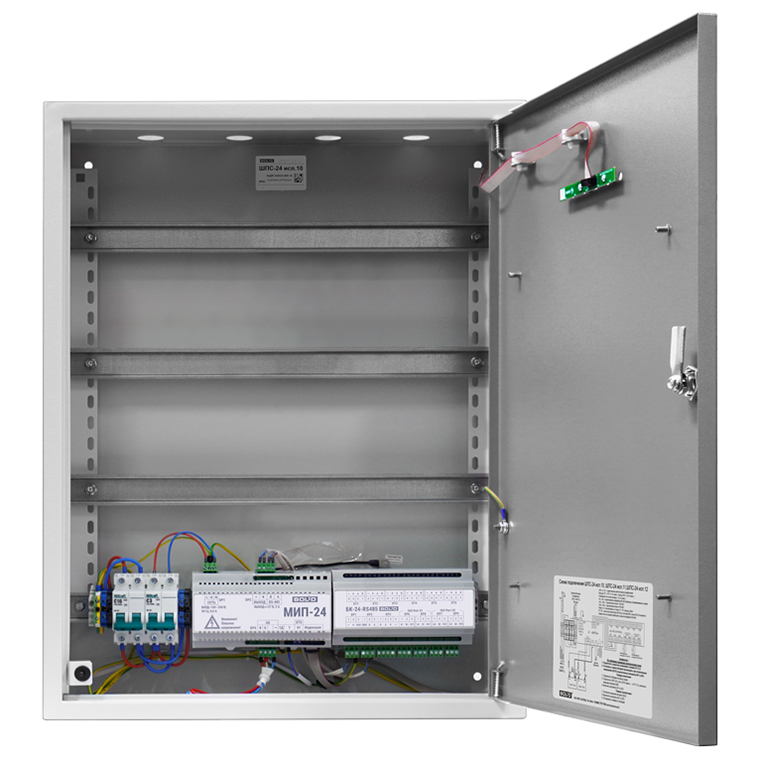 ШПС-24 исп.10 – шкаф с резервированным источником питания. Предназначен для размещения приборов пожарной автоматики, приемно-контрольных приборов охранно-пожарной сигнализации, обеспечения их напряжением питания 24 В, обеспечения связи приборов по интерфейсу RS-485 между собой и внешними контроллерами с учетом требований СП 484.1311500.2020.