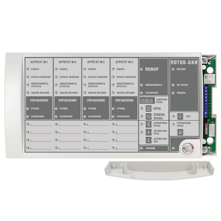 Поток-БКИ (2xRS-485) – блок индикации и управления, предназначен для работы в составе оборудования насосной станции или станции спринклерного, дренчерного, пенного пожаротушения или пожарного водопровода. Работа блока возможна только совместно с сетевым контроллером (пультом "С2000М" в.3.03 и выше).