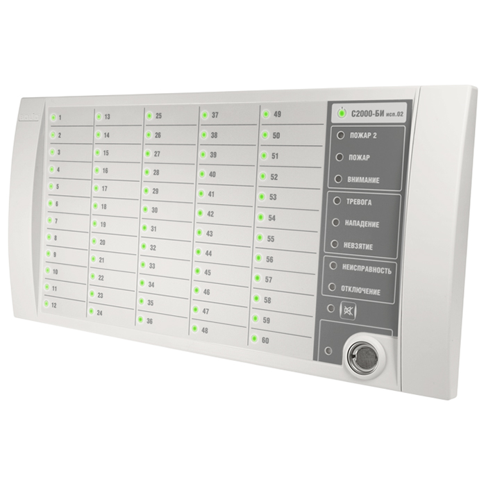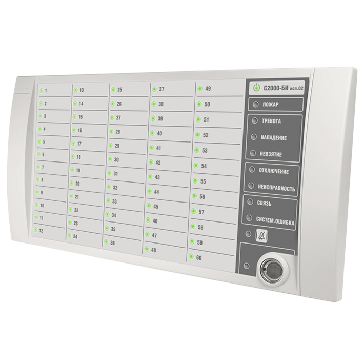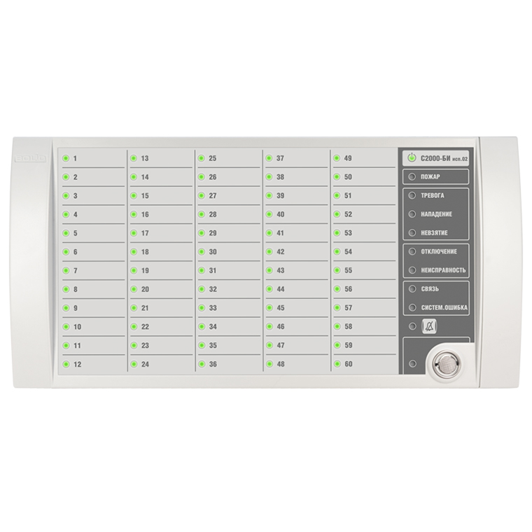 С2000-БИ исп.02 2RS485 – блок индикации, предназначен для работы в составе ИСО "Орион" совместно с сетевым контроллером (пультом контроля и управления охранно-пожарным С2000М или прибором приемно-контрольным и управления пожарным "Сириус", или их исполнениями). Применяется для обеспечения световой и звуковой индикации состояния разделов пожарной, охранной и технологической сигнализации, а также исполнительных устройств противопожарного оборудования, дистанционного взятия на охрану/снятия с охраны разделов охранной и пожарной сигнализации при помощи ключей Touch Memory.