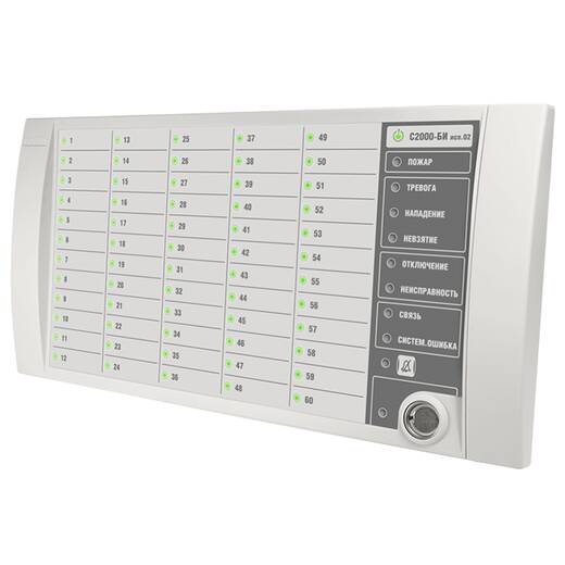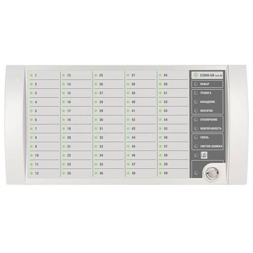 - раздельное отображение на 60 двухцветных индикаторах состояний контролируемых разделов: "Взят", "Взятие", "Снят", "Тревога", "Нападение", "Невзятие", "Пожар", "Внимание", "Неисправность", "Нарушение технолог. ШС", "Норма технолог. ШС", "Протечка", "Повышение/Понижение температуры", "Повышение/Понижение уровня", "Дверь Взломана", "Дверь Заблокирована", "Дверь Открыта/закрыта", "Доступ закрыт/открыт/в норме";