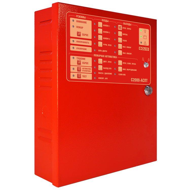 С2000-АСПТ – приёмно-контрольный прибор на 3 шлейфа сигнализации, управляет автоматическими средствами пожаротушения и оповещателями, может работать в составе системы «Орион» или автономно. Прибор производит контроль состояния трёх шлейфов пожарной сигнализации, цепи датчиков состояния дверей, цепи датчиков ручного пуска, цепи контроля выхода огнетушащего вещества, цепи исправности оборудования установки пожаротушения, исправности цепей запуска на обрыв и короткое замыкание.