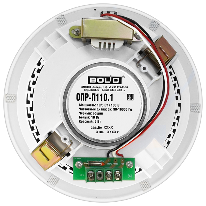 ОПР-П110.1 – потолочный пожарный речевой оповещатель, предназначен для передачи речевого оповещения или специальных сигналов в системах оповещения и управления эвакуацией (СОУЭ), а также передачи речевой информации в системах звуковой трансляции с высокоомным выходом (100 В).