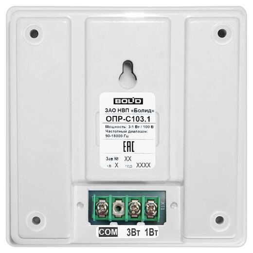 ОПР-С103.1 – настенный пожарный речевой оповещатель, предназначен для передачи речевого оповещения или специальных сигналов в системах оповещения и управления эвакуацией (СОУЭ), а также передачи речевой информации в системах звуковой трансляции с высокоомным выходом (100 В).