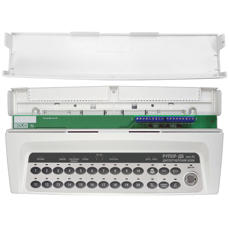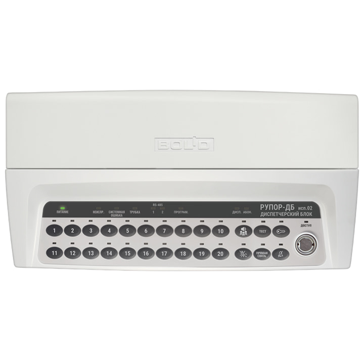 Рупор-ДБ исп.02 – блок, является частью адресного блочно-модульного прибора пожарного управления (ППУ) по ГОСТ 53325-2012 п.7.2.6 и предназначен для обеспечения двунаправленных каналов связи зон пожарного оповещения с помещением пожарного поста. В состав блочно-модульного ППУ, помимо диспетчерского блока, должен входить прибор приемно-контрольный и управления пожарный "Сириус" или пульт контроля и управления (ПКУ) охранно-пожарный "С2000М", или их исполнения. Связь между блоками проводная. Диспетчерский блок применяется совместно с блоком "Рупор-ДК исп.02" (коммутационный блок).