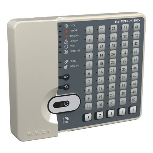 R3-Рубеж-БИУ – блок индикации и управления, предназначен для сбора информации с приемно-контрольных приборов R3-Рубеж-2ОП или контроллера адресных устройств R3-Рубеж-КАУ2 и отображения состояния зон, групп зон, исполнительных адресных устройств на встроенном светодиодном табло, а также управления охранными зонами, пожарными зонами и исполнительными адресными устройствами.