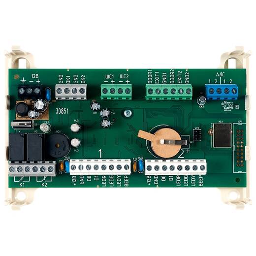 Модуль содержит в своем составе микропроцессор, управляющий работой устройства. Функционально модуль представляет собой устройство управления подключенных к нему считывателей и дистанционно управляемый переключатель двух групп релейных контактов переключающегося типа, а также два выхода с открытым коллектором и входы для подключения охранных датчиков и датчиков дверей.