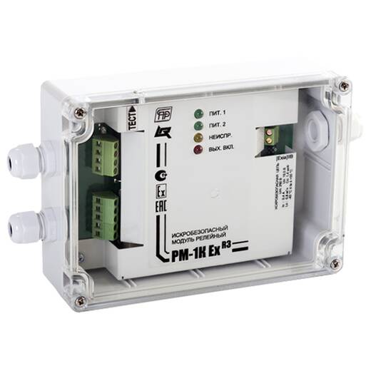 РМ-1К Ex-R3 – адресный релейный модуль искробезопасный, предназначен для управления исполнительными устройствами во взрывоопасных помещения и зонах защищаемого объекта. Релейный модуль работает под управлением приемно-контрольного прибора R3-Рубеж-2ОП или прибора Рубеж-2ОП прот. R3. В качестве нагрузки пусковой цепи могут быть устройства, питающиеся по искробезопасной цепи, такие как: искробезопасные оповещатели, искробезопасные модули пожаротушения и иные искробезопасные нагрузки.